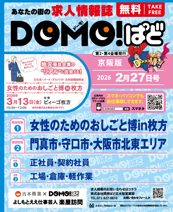 NEWSお知らせ EVENT2026年02月27日 2月27日(金)発行!無料求人情報誌「DOMOぱど」各誌面内容はコチラ! 簡単!便利!すぐに求人情報がつかめて即応募! 関西エリア発行の各誌掲載内容は下記URLから要チェック‼ 京阪版 https://domo.meclib.jp/domop_kh_260227/book/index.html 大阪東部版 https://domo.meclib.jp/domop_ot_260227/book/index.html 南大阪版 https://domo.meclib.jp/domop_mo_260227/book/index.html 泉州版 https://domo.meclib.jp/domop_sh_260227/book/index.html 和歌山版 https://domo.meclib.jp/domop_wk_260227/book/index.html 「DOMO!ぱどNET関西」でも最新求人情報をチェック! ↓↓↓↓↓ https://domonet.jp/pado 前へ トップページへ 次へ