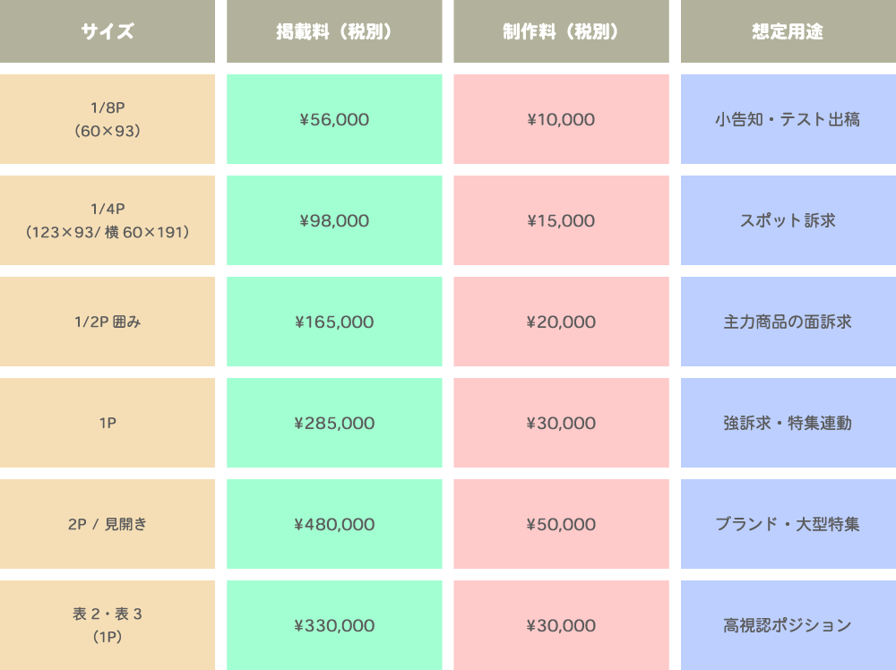 視認性重視。表2・表3や特集対向など、面展開でダイレクトに訴求。